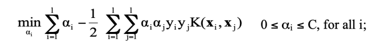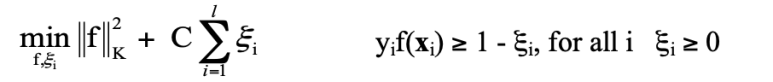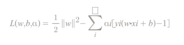 이런 수식이 주어지는데, 앞부분은 우리가 최소화 하려는 마진 크기이고, 뒷부분은 조건을 맞추기 위한 식이다.