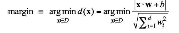 x: 데이터 포인트 / w: 초평면의 가중치 벡터 / b: 바이어스